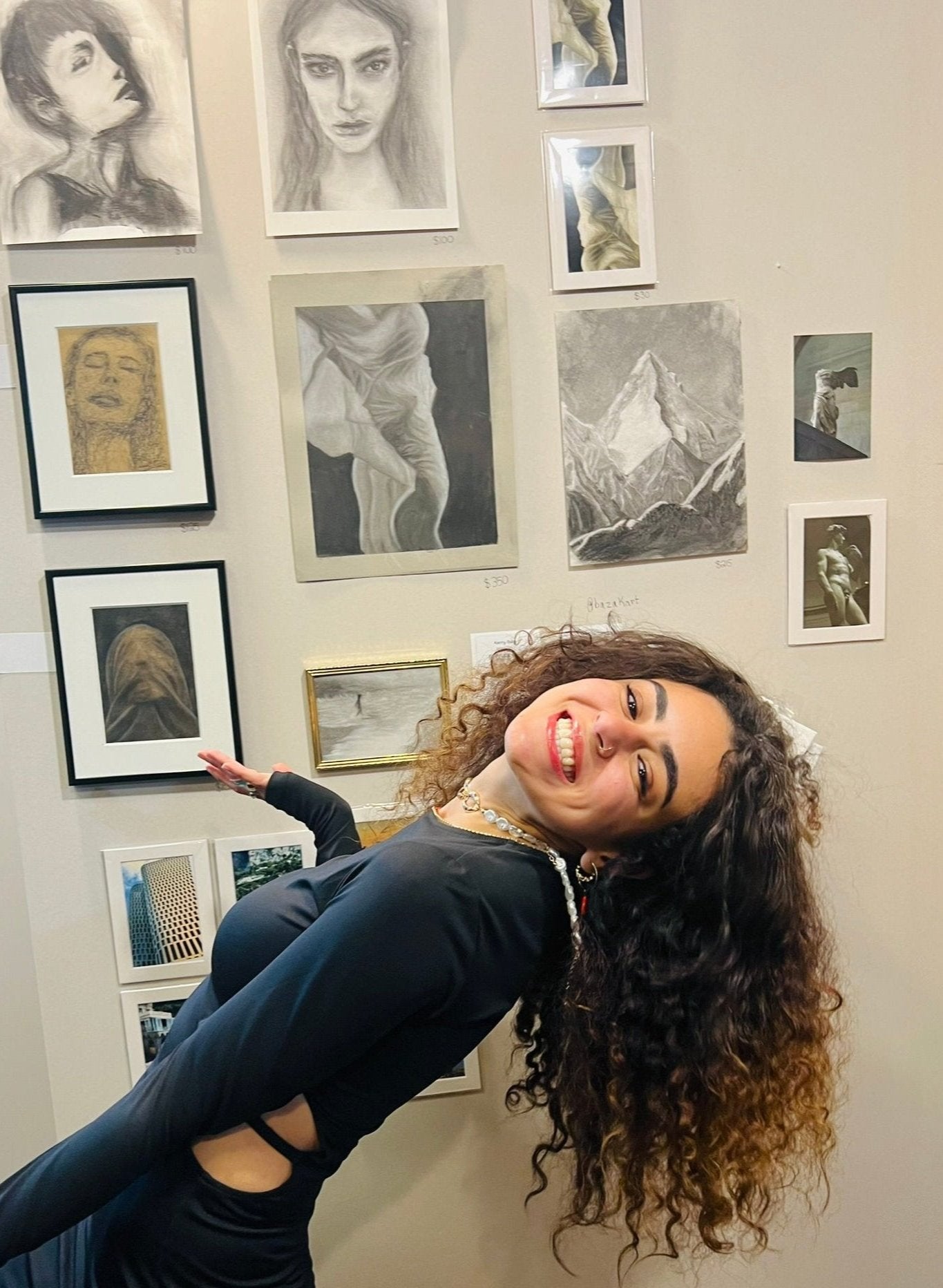 Karima is a contemporary artist based in Seattle, originally born in the emerald city and having grown up in Cairo,Egypt. Specializing in charcoal and oil painting, she explores the intersection of memory and experience, transforming personal photographs into evocative artworks.